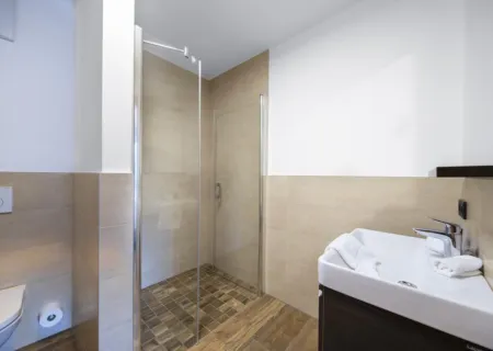 Badezimmer mit Dusche, Waschbecken und WC
