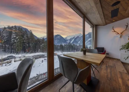 Enjoy the 8-person Chalet Bachmayrspitze! After a wonderful day in the Austrian mountain air, sit back and enjoy the setting sun from the lounge corner on the large, partially covered terrace or relax in the Finnish sauna with a relaxation room.